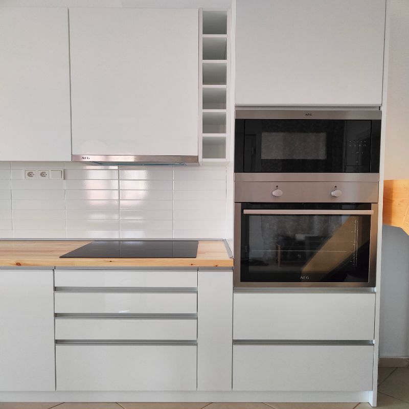 ✔ Μοριοσανίδα με επένδυση λευκής μελαμίνης: έχει καθιερωθεί σε πολλές ευρωπαϊκές χώρες ως το στάνταρ για την κατασκευή κουζίνας, το ίδιο και σε εμάς, καθότι καθαρίζεται εύκολα και αποτελεί λευκό «καμβά» για την αποθήκευση των αντικειμένων σας